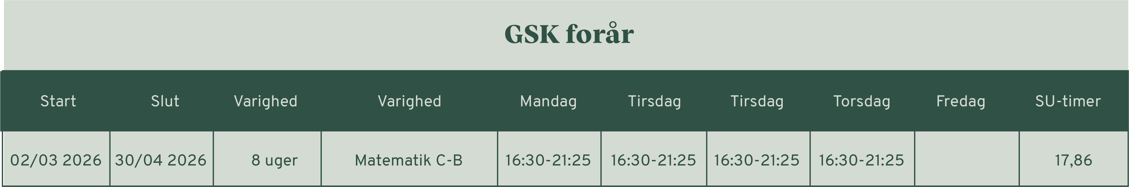 Mangler du et fag eller har du brug for at opkvalificere et af dine fag, for at kunne søge ind på en videregående uddannelse? Holdinfo og tidspunkter finder du i skemaet herunder. Du tilmelder dig GSK via KVUC's hjemmeside her.
